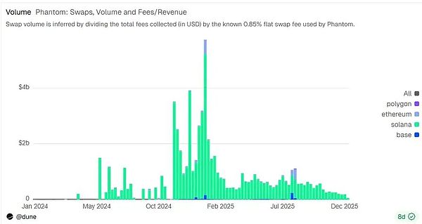 특히 사용자 증가는 밝은 면입니다. 팬텀의 월간 활성 사용자는 연초의 ( 15명에서   ) 연초에는 1,500만 건에서 연말에는 2,000만 건에 육박할 것으로 예상됩니다. 이는 독립 지갑 중 가장 높은 성장률로, 특히 인도와 나이지리아 등 신흥 시장에서 사용자 증가세가 두드러집니다.