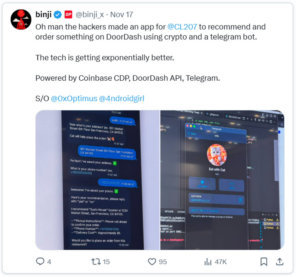 투기적이지 않은 애플리케이션 시나리오 - 예를 들어 @xpticket을 통해 티켓을 구매하거나 스테이블코인 포트폴리오의 수익을 최적화하거나 DoorDash에서 음식을 구매하도록 허용하는 등의 시나리오를 푸시합니다.